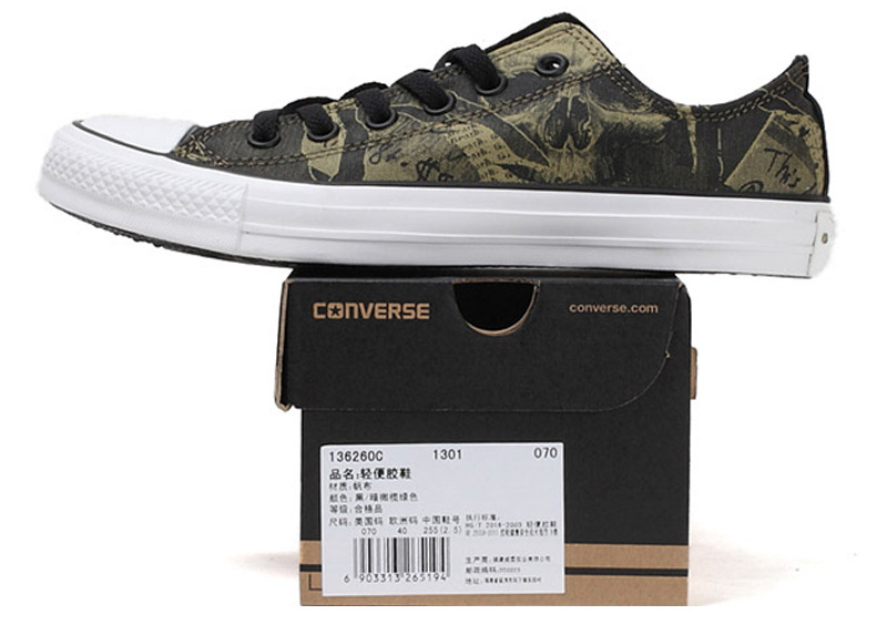 - 簡介:匡威136260-2013年新款136260經典的骷髏頭,加上文字的拼接印刷,結合鞋圍邊的做舊效果和低幫設計,凸顯潮流搖滾范兒。帆布,黑/暗橄欖綠色暫無庫存,可加微信客服咨詢:CONSLVIE-COM